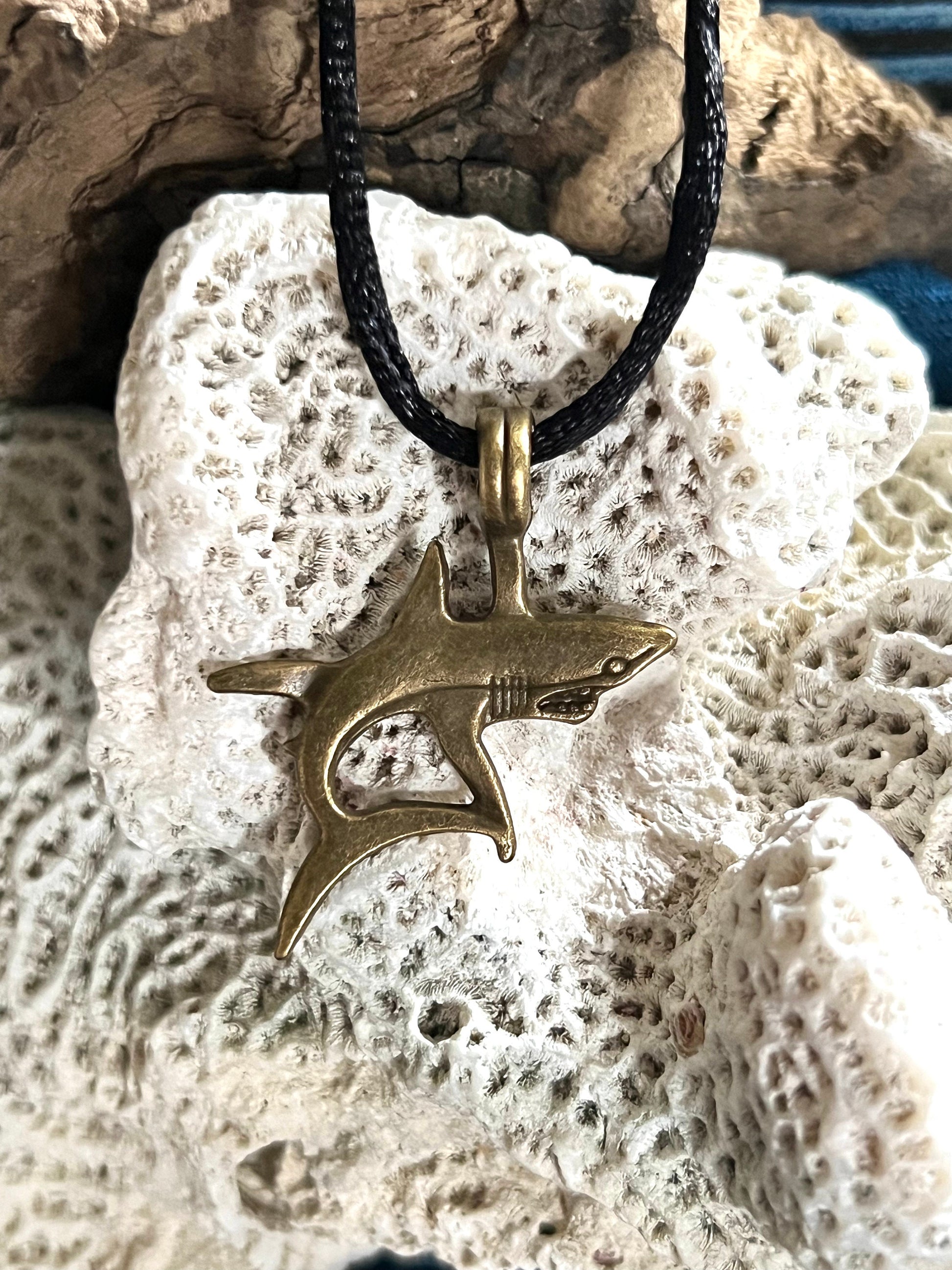 Antique Brass Plated Shark Pendant with 18” or 26” black cord.